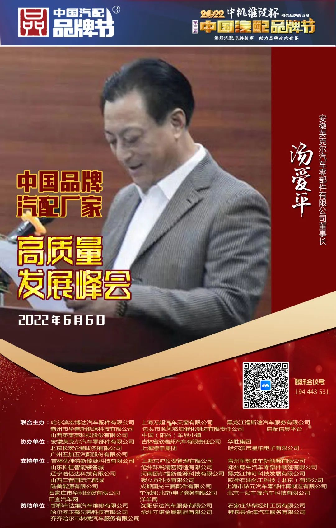 湯愛平董事長是全國杰出浙商,現(xiàn)任中汽聯(lián)理事長、臺州英克爾傳動軸有限公司董事長,安徽英克爾汽車零部件有限公司董事長。先后擔(dān)任玉環(huán)市汽摩配行業(yè)副會長、浙江省汽摩配行業(yè)商會副會長、全國工商聯(lián)汽摩配用品制造分會副會長、工信部中國電子商務(wù)協(xié)會汽車行業(yè)分會常務(wù)副會長、中國質(zhì)量萬里行促進會汽車委員會常務(wù)副會長、全國工商聯(lián)汽車經(jīng)銷商商會后市場分會常務(wù)副會長、中國汽車工業(yè)協(xié)會后市場用品分會常務(wù)副會長等職務(wù)。