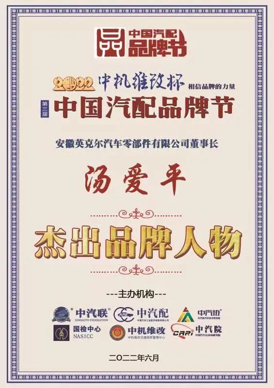 據(jù)《2022中國汽配品牌榜》榜單顯示:安徽英克爾董事長湯愛平 榮膺“2022中國汽配行業(yè)杰出品牌人物”、英克爾榮膺“中國汽配行業(yè)杰出品牌企業(yè)”兩項大獎。