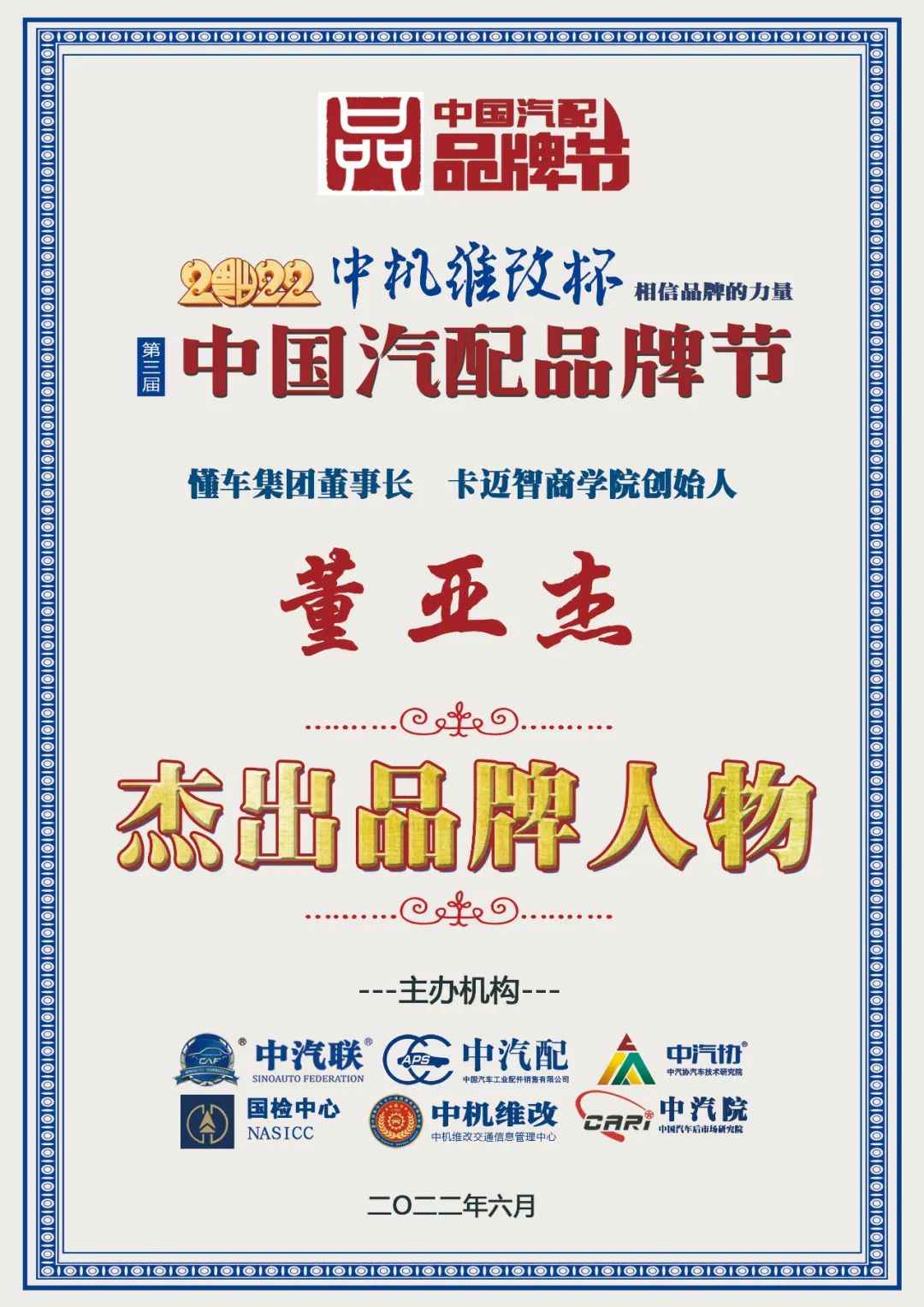 據(jù)《2022中國汽配品牌榜》榜單顯示:懂車集團董事長董亞杰榮膺“2022中國汽配行業(yè)杰出品牌人物”大獎。