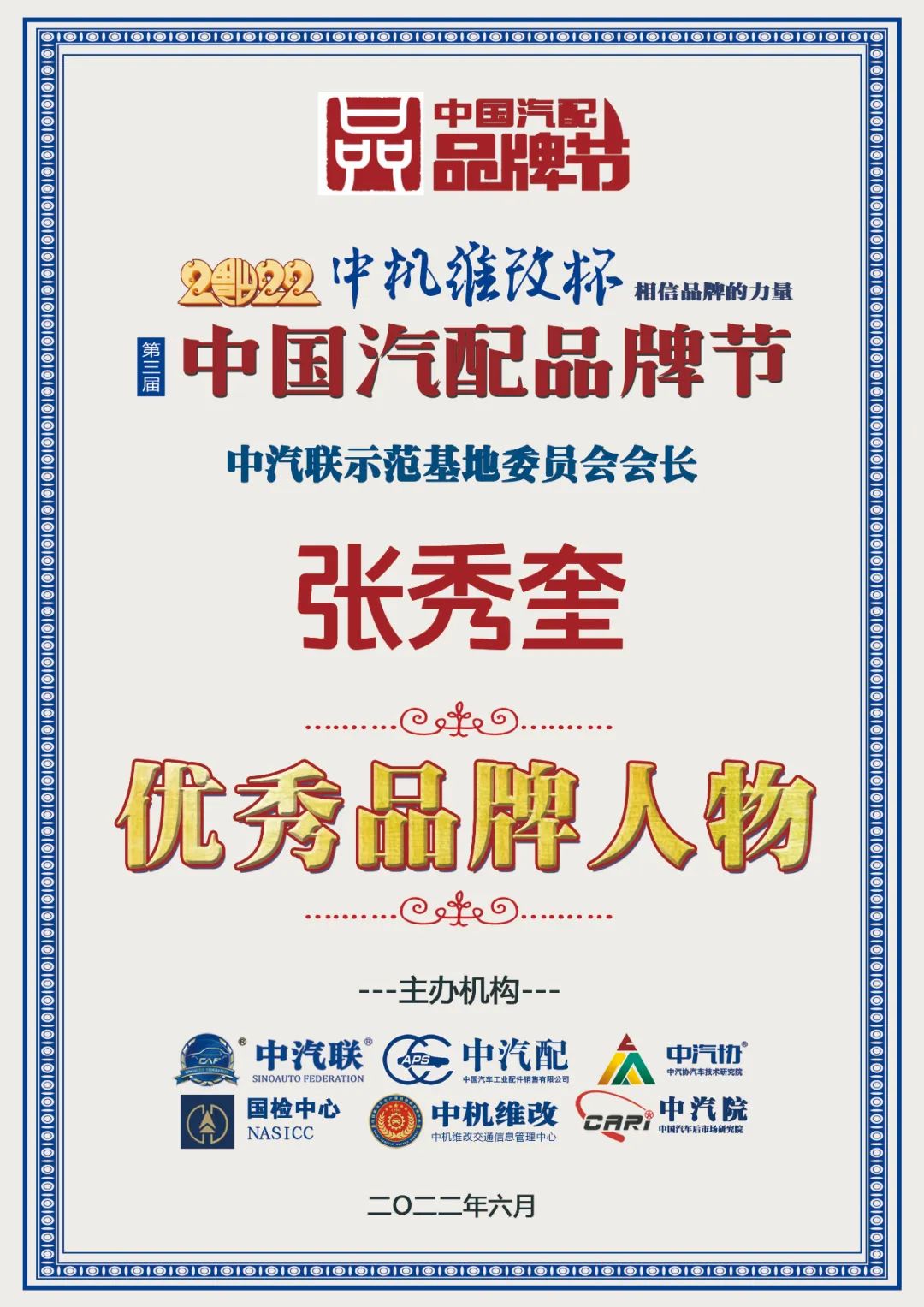 據(jù)《2022中國(guó)汽配品牌榜》榜單顯示:中汽聯(lián)示范基地委員會(huì)會(huì)長(zhǎng)張秀奎榮膺“2022中國(guó)汽配行業(yè)優(yōu)秀品牌人物”大獎(jiǎng)