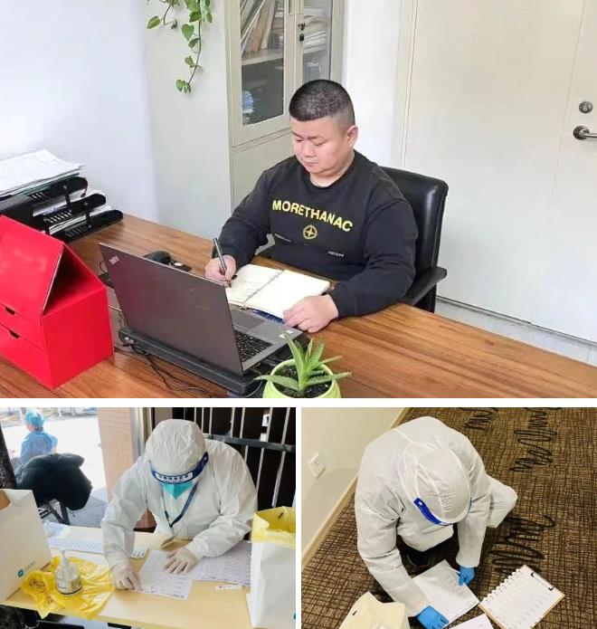 物業(yè)主管徐仲卿所負(fù)責(zé)的燎申宜山大廈內(nèi),既有數(shù)十家商務(wù)辦公企業(yè),也有一家漢庭酒店,進出人員來自市內(nèi)外各地區(qū),對物業(yè)部的疫情防控工作提出了較大挑戰(zhàn)。四月上旬,酒店內(nèi)出現(xiàn)一例核酸異常人員,旅客及工作人員都要進行自我隔離,酒店的日常監(jiān)管工作便轉(zhuǎn)移到了大廈物業(yè)部,徐仲卿作為部門負(fù)責(zé)人,承擔(dān)起了酒店日常管理及人員聯(lián)絡(luò)工作,保障隔離人員的一日三餐和正常生活供應(yīng)。每天兩次自測抗原時,徐仲卿穿著隔離服,挨個房間將抗原發(fā)放給大廈內(nèi)所有隔離人員,然后再逐一收回,并做好拍照登記工作,核酸采樣時也親自陪同醫(yī)護人員上門采樣。