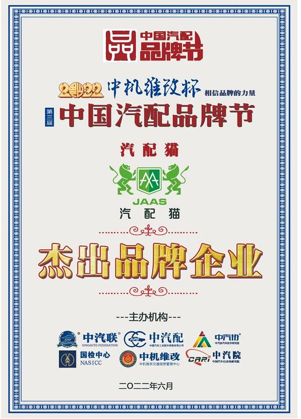 據(jù)《2022中國汽配品牌榜》榜單顯示:汽配貓榮膺“2022中國汽配行業(yè)杰出品牌企業(yè)”大獎。