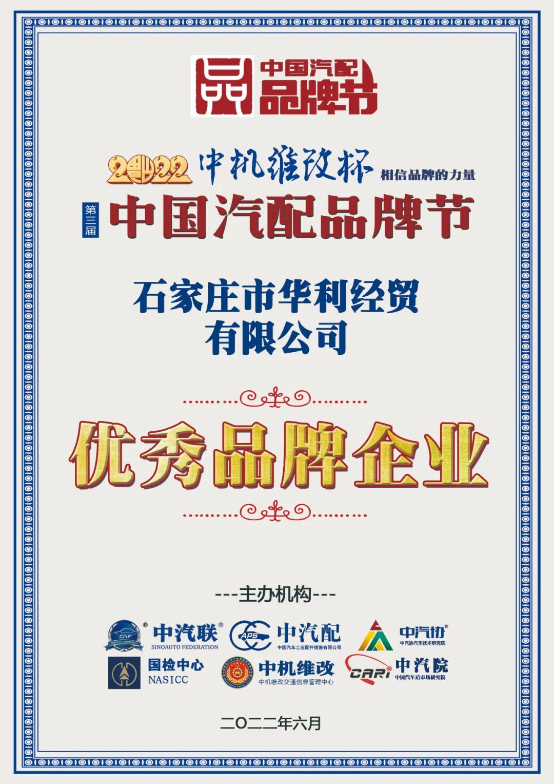 石家莊市華利經(jīng)貿(mào)榮膺2022中國汽配行業(yè)優(yōu)秀品牌企業(yè)大獎!