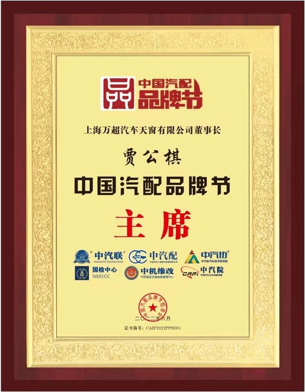 2022年6月26日,“上海萬超汽車天窗有限公司董事長賈公棋先生收到了一封來自北京的特殊認(rèn)命書,”正式任命賈公棋董事長為中國汽配品牌節(jié)主席,賈公棋董事長在收到牌匾和聘書之后心中無比激動,感謝組織對他的高度認(rèn)可以及信任,并表示既然組織這么信任他,接下去幾年一定要帶領(lǐng)大家辦好《中國汽配品牌節(jié)》這個重要的節(jié)日,履行自己的職責(zé)!