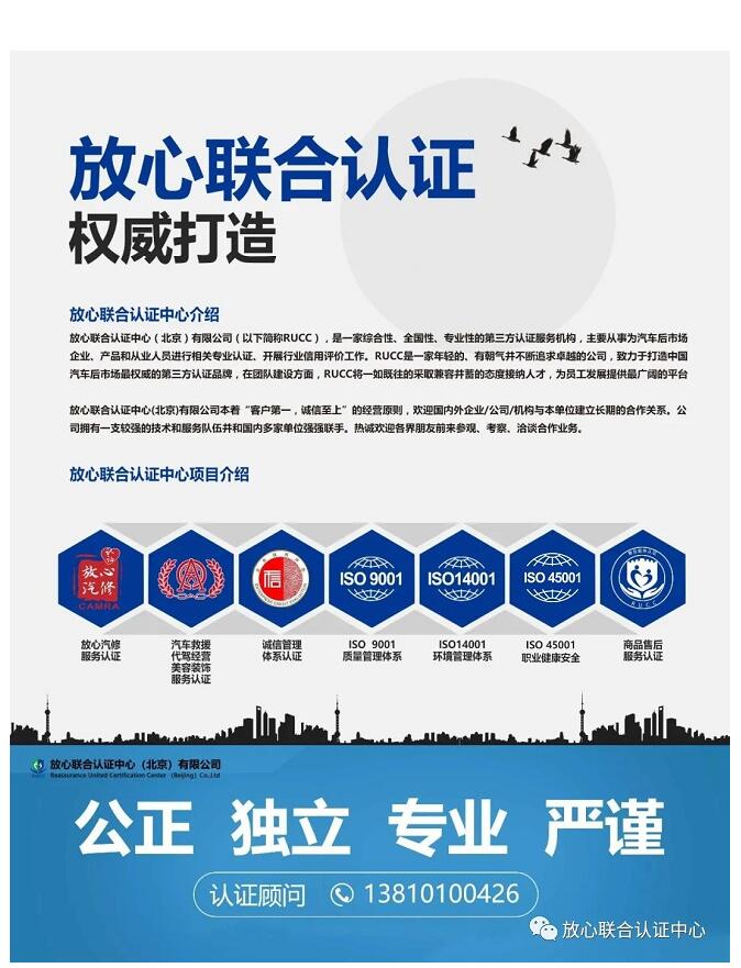 放心聯(lián)合認(rèn)證中心(北京)有限公司是經(jīng)國家認(rèn)證認(rèn)可監(jiān)督管理委員會(huì)批準(zhǔn),在北京工商行政管理局注冊(cè)的企業(yè)法人,本中心成立于2016年。是國內(nèi)最早批準(zhǔn)具有服務(wù)認(rèn)證資質(zhì)的第三方認(rèn)證機(jī)構(gòu) 。其“放心汽修”服務(wù)認(rèn)證在國內(nèi)具有權(quán)威性。