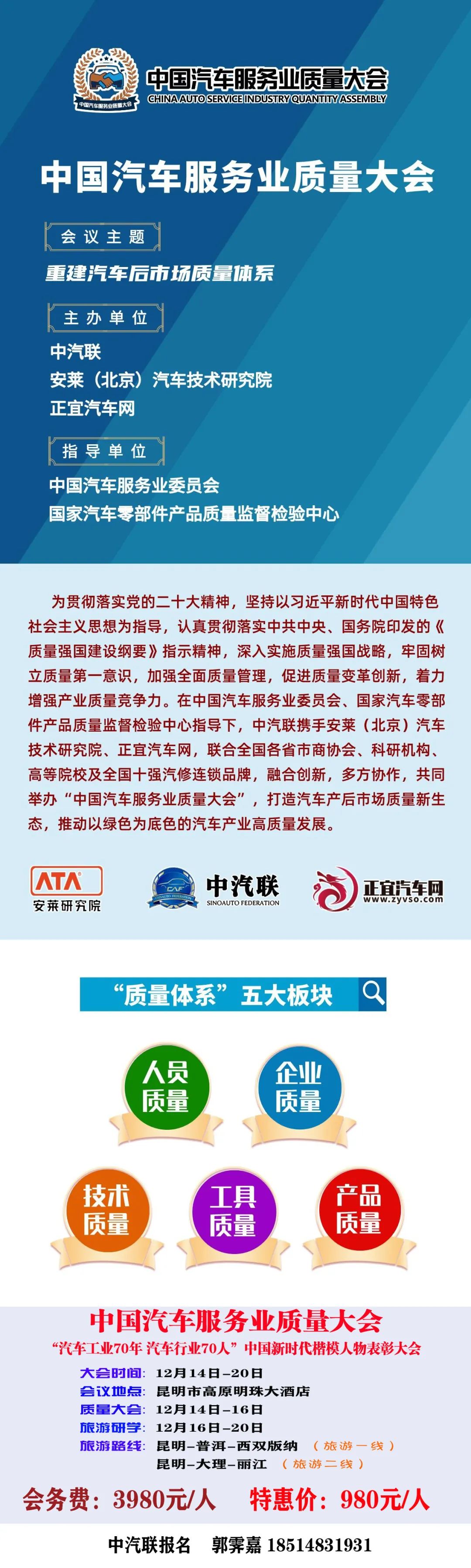 不朽功勛,鐫刻汽車行業(yè)發(fā)展史冊;光輝榜樣,照亮汽車行業(yè)復(fù)興征程。2023年12月15日,“汽車工業(yè)70年 汽車行業(yè)70人”中國新時代楷模人物表彰大會將在昆明市高原明珠大酒店舉辦,同期將舉辦“中國汽車服務(wù)業(yè)質(zhì)量大會”,歡迎汽車行業(yè)新時代楷模人物的到來!