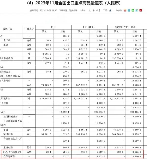 日前,海關(guān)總署發(fā)布數(shù)據(jù):11月,汽車(包括底盤)共出口52.4萬(wàn)輛,出口金額為704.8億元。1-11月,累計(jì)出口476.2萬(wàn)輛,同比增長(zhǎng)59.8%;出口總金額為6529.2億元,增長(zhǎng)79.6%。