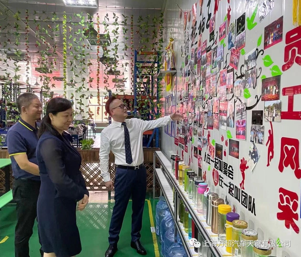 在參觀員工休息區(qū)時,賈董事長向來賓們介紹了公司的企業(yè)文化,并說到公司推行半軍事化管理以來,公司整體的精神面貌、員工的自律性、執(zhí)行力都得到了有效的提升,讓他們清晰的了解上海萬超的企業(yè)文化的特色。