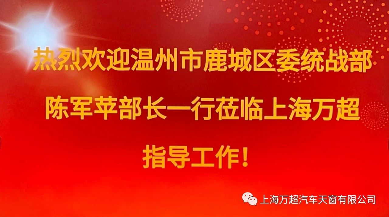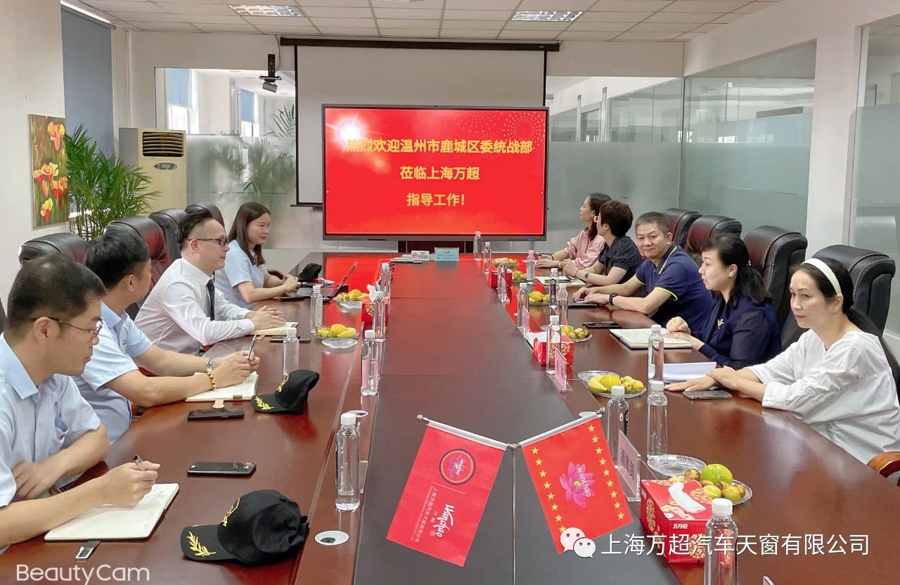 2021年9月9日上午,溫州市鹿城區(qū)委常委、區(qū)委統(tǒng)戰(zhàn)部部長陳軍蘋、區(qū)委統(tǒng)戰(zhàn)部常務(wù)副部長鄒本篤、區(qū)委統(tǒng)戰(zhàn)部副部長、區(qū)橋辦主任謝璇、區(qū)委統(tǒng)戰(zhàn)部工作人員郭超、葉瑋倩等領(lǐng)導(dǎo)一行蒞臨上海萬超汽車天窗有限公司指導(dǎo)工作,上海萬超汽車天窗有限公司董事長賈公棋接待了來賓,對溫州市鹿城區(qū)委統(tǒng)戰(zhàn)部陳軍蘋部長一行的來訪表示熱烈歡迎。相關(guān)部門負(fù)責(zé)人陪同參加。