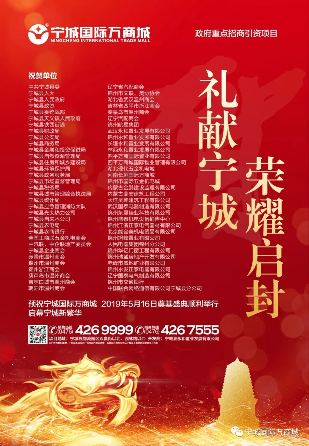 2019年5月16日,寧城國際商貿(mào)城奠基儀式隆重舉行。全國工商聯(lián)原副主席、中國西部研究與發(fā)展促進會理事長程路,寧城縣縣委書記張恒,寧城縣人大主任張海琴,寧城縣長馬占國,寧城政協(xié)主席謝小雙,寧城縣統(tǒng)戰(zhàn)部部長白景輝,寧城縣副縣長夏景圖,寧城縣副縣長王鐵鋼,全國工商聯(lián)五金機電商會常務(wù)副會長勞建斌、秘書長顏葉,中汽聯(lián)執(zhí)行會長喬永鋒,中汽聯(lián)地產(chǎn)委員會秘書長吳志平,寧城永和置業(yè)有限公司董事長葉永才、總經(jīng)理吳江洪,寧城國際萬商城副總經(jīng)理何益平、葉建文、王寶松等領(lǐng)導(dǎo)和嘉賓共2000余人參加了奠基儀式。