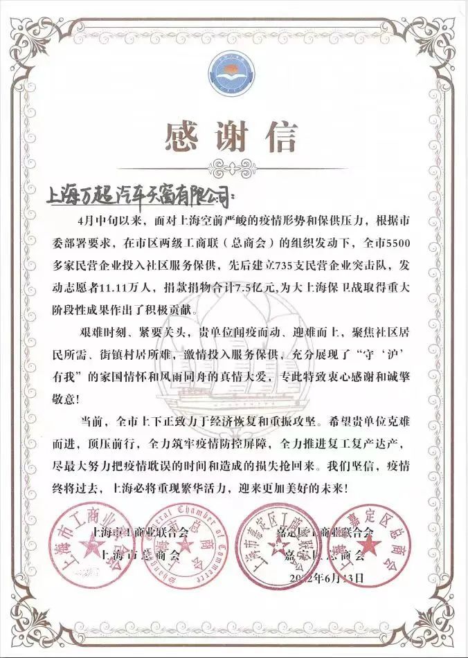 近日,上海萬(wàn)超汽車(chē)天窗有限公司董事長(zhǎng)賈公棋收到了來(lái)自上海市工商業(yè)聯(lián)合會(huì)、上海市總商會(huì)、上海市嘉定區(qū)工商業(yè)聯(lián)合會(huì)、上海市嘉定區(qū)總商會(huì)聯(lián)合發(fā)來(lái)的感謝信,感謝萬(wàn)超在上海疫情艱難關(guān)頭,聞疫而動(dòng),迎難而上,聚焦社區(qū)居民所需、街道居民所難,激情投入服務(wù)保障,充分展現(xiàn)了“守滬有我”的家國(guó)情懷和風(fēng)雨同舟的真情大愛(ài),為大上海保衛(wèi)戰(zhàn)取得階段中成果做出了積極貢獻(xiàn)。