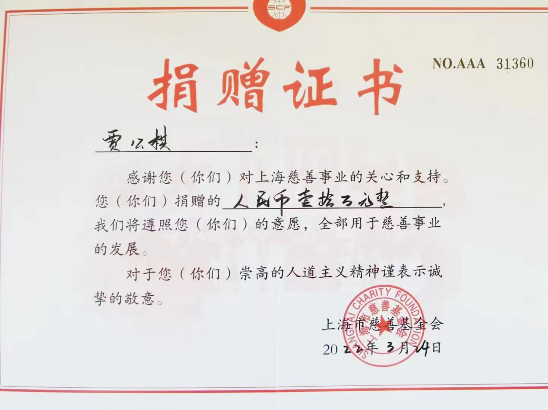 萬(wàn)超董事長(zhǎng)賈公棋榮收到上海市區(qū)兩級(jí)總商會(huì)發(fā)來(lái)的感謝信
