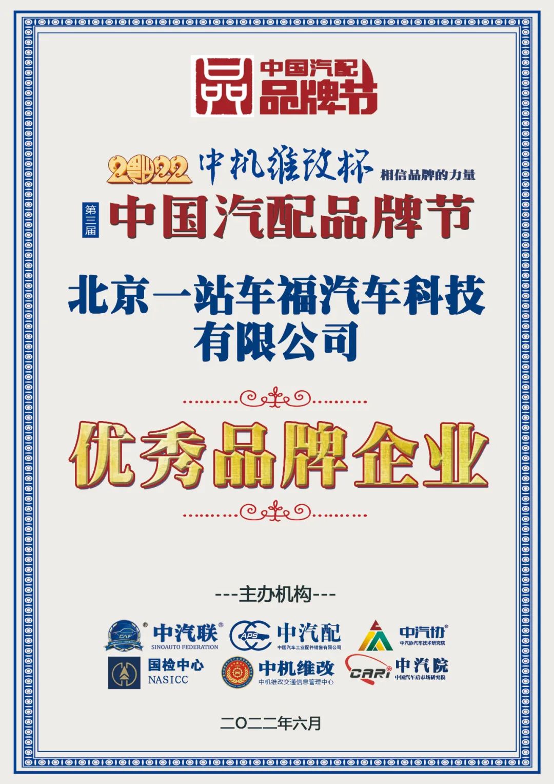 北京一站車福榮膺2022年中國汽配行業(yè)優(yōu)秀品牌企業(yè)大獎