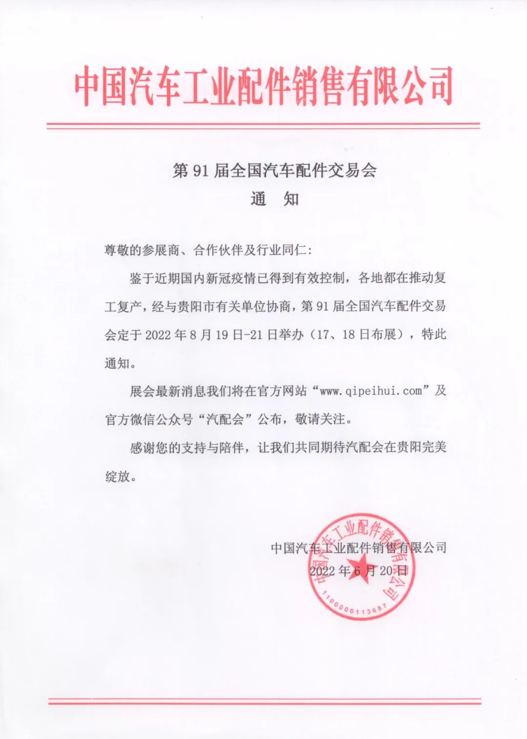 第91屆全國汽配會將于8月19-21日貴陽舉行