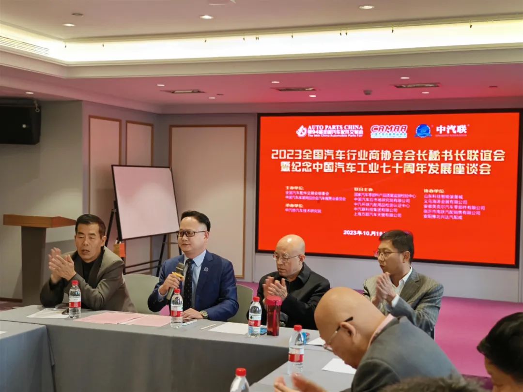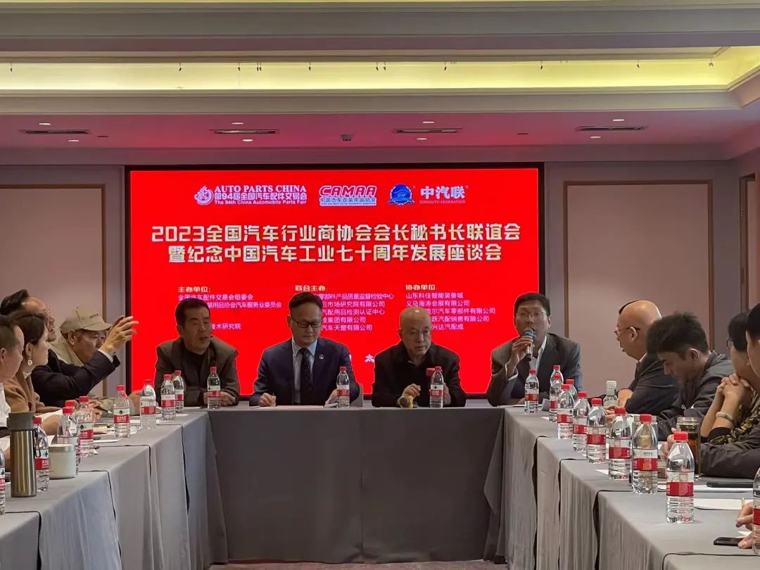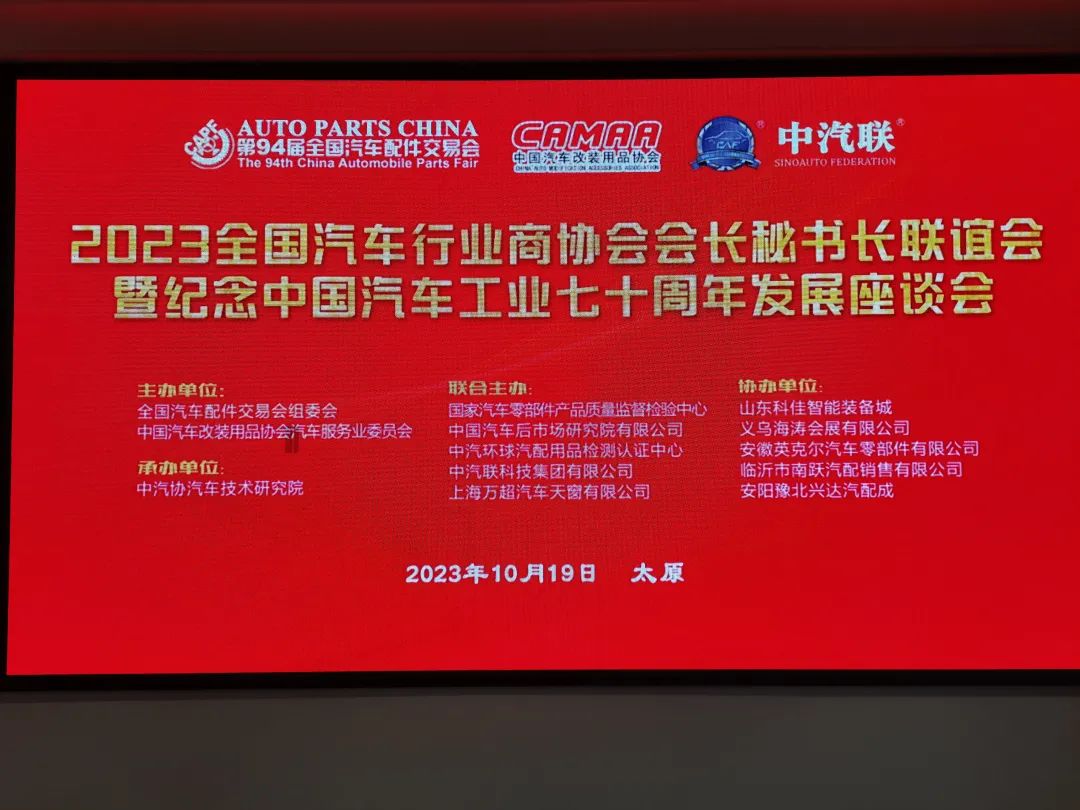 2023年10月19日,2023全國汽車行業(yè)商協(xié)會會長秘書長聯(lián)誼會暨紀(jì)念中國汽車工業(yè)七十周年發(fā)展座談會在太原市成功召開。中汽聯(lián)會長、中國汽車服務(wù)業(yè)會會長王篤洋,中汽聯(lián)主席、上海萬超汽車天窗有限公司董事長賈公棋,中汽聯(lián)常務(wù)副主席、國家汽車零部件產(chǎn)品質(zhì)量監(jiān)督檢驗中心副主任、中汽環(huán)球汽配用品檢測認(rèn)證中心主任楊貴霖,中國汽車工業(yè)配件銷售有限公司總經(jīng)理助理李素文,中國汽車工業(yè)配件銷售有限公司行業(yè)辦主任、中國汽車服務(wù)業(yè)委員會秘書長劉俐,中汽聯(lián)副會長、河南安陽豫北汽配城總經(jīng)理馮長友,中汽聯(lián)副會長、濟南重汽零部件協(xié)會會長劉昌勇,中汽聯(lián)副會長、包頭市順風(fēng)燃油催化器制造有限公司董事長張志玲,中汽聯(lián)副會長、山西三晉渤海市場經(jīng)營管理有限公司董事長宓建余,中汽聯(lián)副會長、齊河縣創(chuàng)興市場經(jīng)營管理有限公司總經(jīng)理劉小斌,中汽聯(lián)副會長、同濟大學(xué)區(qū)塊鏈創(chuàng)新應(yīng)用實驗室副主任戴文浦,中汽聯(lián)秘書長、中汽聯(lián)合文化傳媒有限公司董事長郭霽嘉,義烏汽摩配協(xié)會會長、義烏海濤會展有限公司董事長吳潮奎,正宜汽車網(wǎng)創(chuàng)始人王忠啟,中國汽車服務(wù)業(yè)委員會副秘書長、山東科佳智能裝備城招商總監(jiān)許婧,博林高科(北京)石油化工有限公司董事長孫博林,湖北大明實業(yè)集團有限公司總經(jīng)理王蔚,浙江高德士潤滑科技有限公司總經(jīng)理劉勝倫,中汽聯(lián)副秘書長、成都雙流汽摩配商會秘書長唐云光,山西省汽貿(mào)聯(lián)盟商會常務(wù)副會長兼秘書長焦麟翔,石家莊機動車配件市場行業(yè)商會秘書長田新立,青島市汽車配件用品流通協(xié)會王法德、河北省汽車后市場商會秘書長朱榮,等領(lǐng)導(dǎo)和嘉賓約100余人參加會議,會議由中汽聯(lián)執(zhí)行會長、中汽協(xié)汽車技術(shù)研究院院長喬永鋒主持。