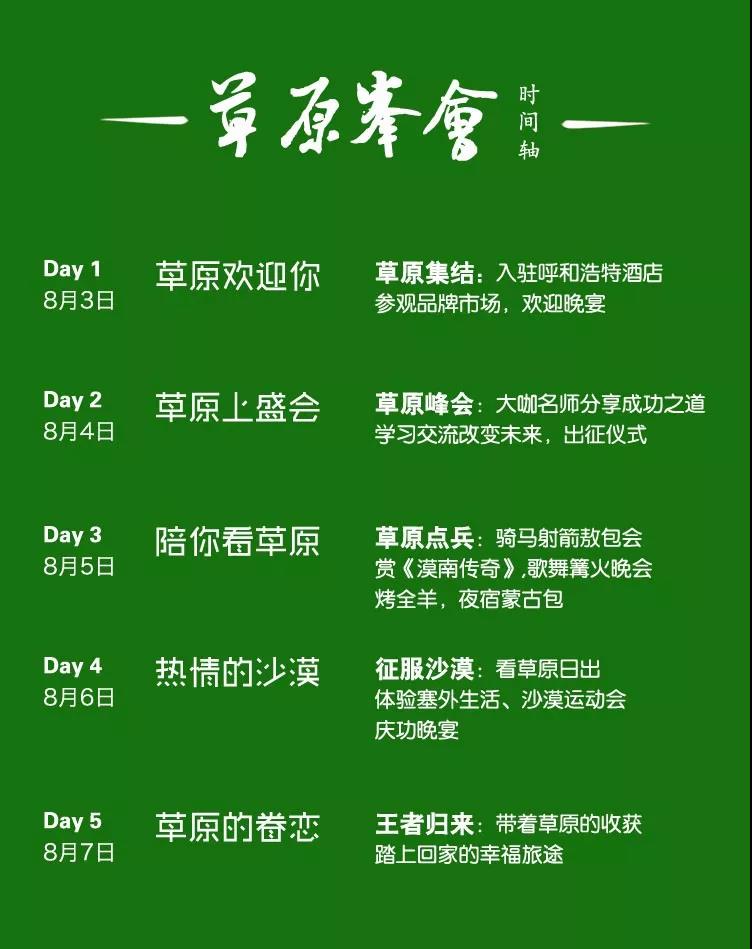 費用包括游學期間峰會、學習、資料、服裝、旅游、考察、戶外拓展、交通、四晚住宿(8月3日、4日、6日雙人四星酒店標間,8月5日草原蒙古包)、餐飲等費用。