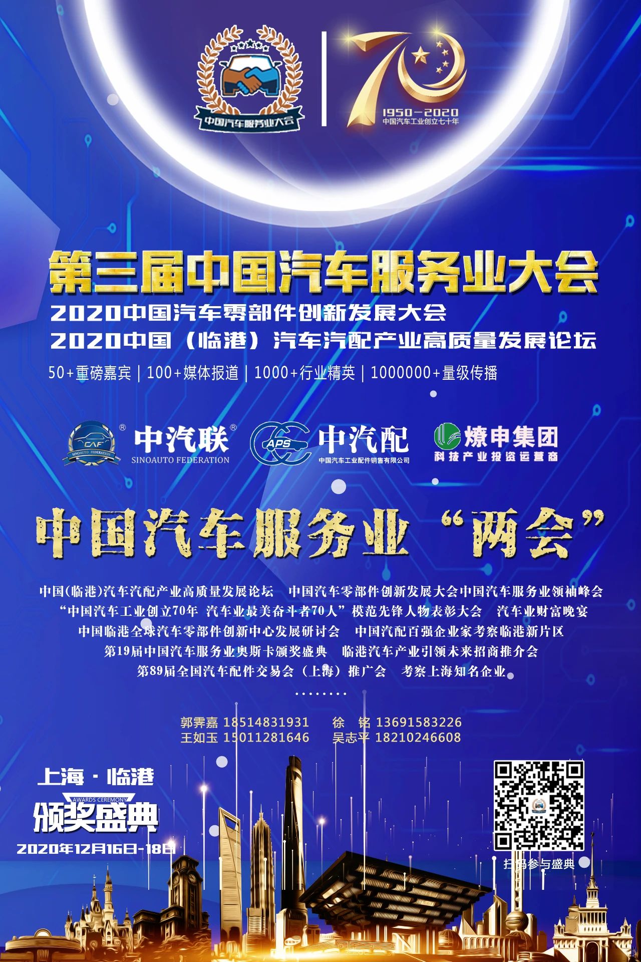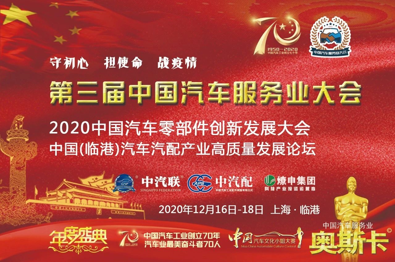 據(jù)悉,2020年是全面建成小康社會和“十三五”規(guī)劃收官之年,是謀劃“十四五”規(guī)劃的關鍵之年,也是中國汽車工業(yè)創(chuàng)立70年,為貫徹落實黨的十九大精神,認真貫徹落實國務院辦公廳關于“提升大眾創(chuàng)業(yè)萬眾創(chuàng)新示范基地帶動作用 進一步促改革穩(wěn)就業(yè)強動能”的實施意見(國辦發(fā)〔2020〕26號),深入實施創(chuàng)新驅(qū)動發(fā)展戰(zhàn)略,推動疫情新常態(tài)下的創(chuàng)新創(chuàng)業(yè)高質(zhì)量發(fā)展,進一步推動經(jīng)濟新常態(tài)下我國汽車企業(yè)實現(xiàn)可持續(xù)發(fā)展,中汽聯(lián)擬以“守初心、擔使命、戰(zhàn)疫情”為主題的第三屆中國汽車服務業(yè)大會、2020中國汽車零部件創(chuàng)新發(fā)展大會(簡稱:中國汽車服務業(yè)“兩會”)暨2020中國(臨港)汽車汽配產(chǎn)業(yè)高質(zhì)量發(fā)展論壇于2020年12月16日-18日在中國(上海)自由貿(mào)易試驗區(qū)臨港新片區(qū)盛大舉行,并將集中表彰汽車行業(yè)在發(fā)展歷程中做出貢獻的模范先鋒人物,向不平凡的2020年獻禮!