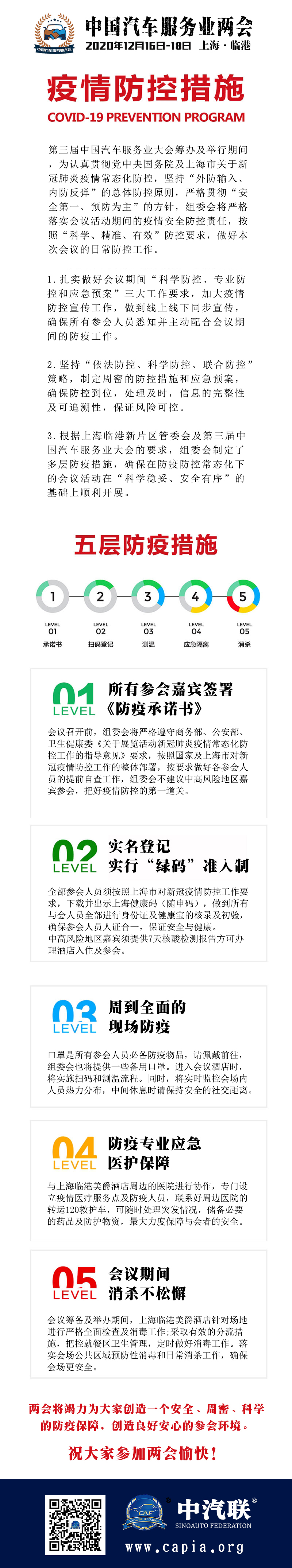 第三屆中國汽車服務(wù)業(yè)大會籌辦及舉行期間,為認真貫徹黨中央國務(wù)院及上海市關(guān)于新冠肺炎疫情常態(tài)化防控,堅持“外防輸入、內(nèi)防反彈”的總體防控原則,嚴格貫徹“安全第一、預(yù)防為主”的方針,組委會將嚴格落實會議活動期間的疫情安全防控責任,按照“科學(xué)、精準、有效”防控要求,做好本次會議的日常防控工作。