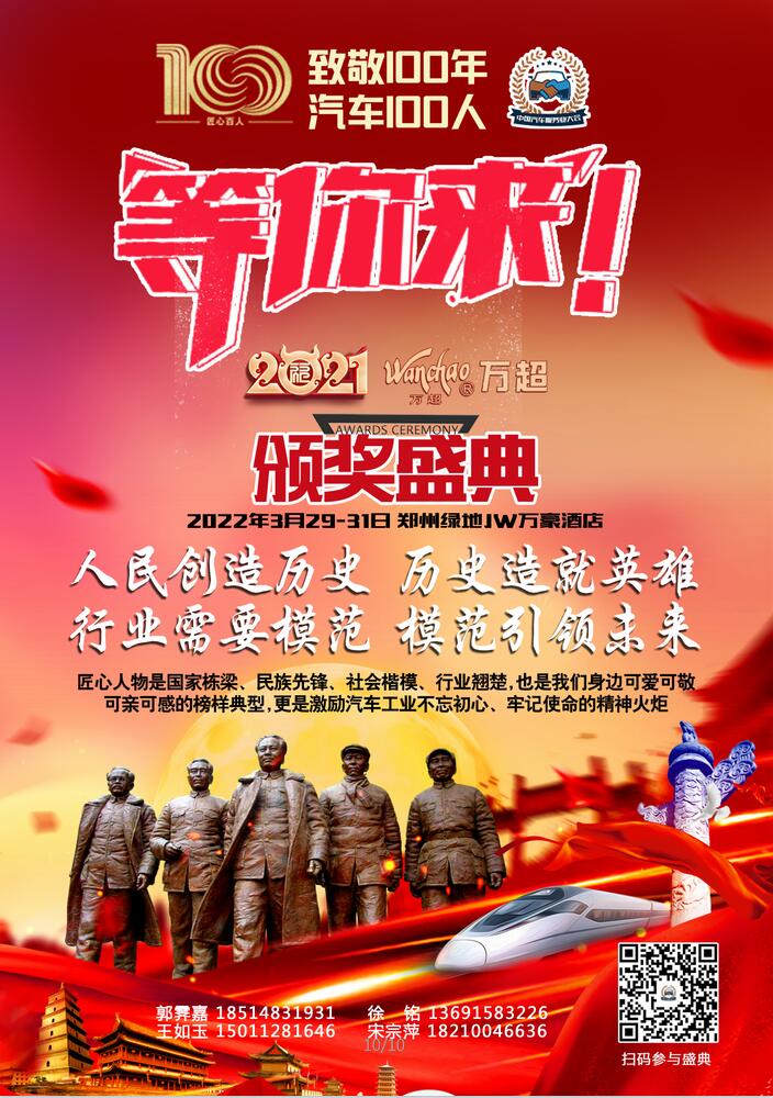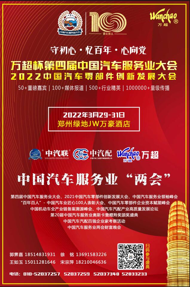 不忘初心,牢記使命。為貫徹落實國務院辦公廳關于服務“六穩(wěn)”“六保”進一步做好“放管服”改革有關工作的意見(國辦發(fā)〔2021〕10號)精神,立足新發(fā)展階段、貫徹新發(fā)展理念、構建新發(fā)展格局,深入實施創(chuàng)新驅動發(fā)展戰(zhàn)略,推動汽車產業(yè)高質量發(fā)展,中汽聯(lián)擬在有關部門支持下,由國家汽車零部件產品質量監(jiān)督檢驗中心、中國汽車工業(yè)配件銷售有限公司、中國車后市場研究院有限公司、中國維改交通信息管理中心、中汽環(huán)球汽配用品檢測認證中心、上海萬超汽車天窗有限公司等機構主辦的以“守初心、憶百年、心向黨”為主題的“萬超杯”第四屆中國汽車服務業(yè)大會、2021中國汽車零部件創(chuàng)新發(fā)展大會(簡稱:2021“萬超杯”中國汽車服務業(yè)“兩會”)將于2022年3月29-31日在鄭州綠地JW萬豪酒店舉行(俗稱的“大玉米”、“玉米棒”,高280米共60層,被譽為華中第一高樓,鄭州地標性建筑之一),敬請您在百忙中出席。