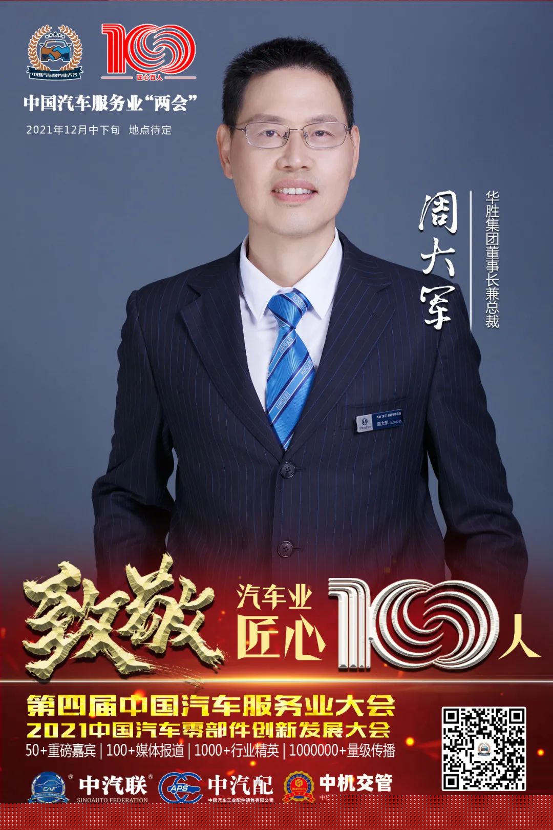 據(jù)第四屆中國汽車服務(wù)業(yè)大會組委會介紹,中汽聯(lián)主席團(tuán)主席、華勝集團(tuán)總裁兼董事長周大軍入選“百年百人”中國汽車業(yè)匠心100人。