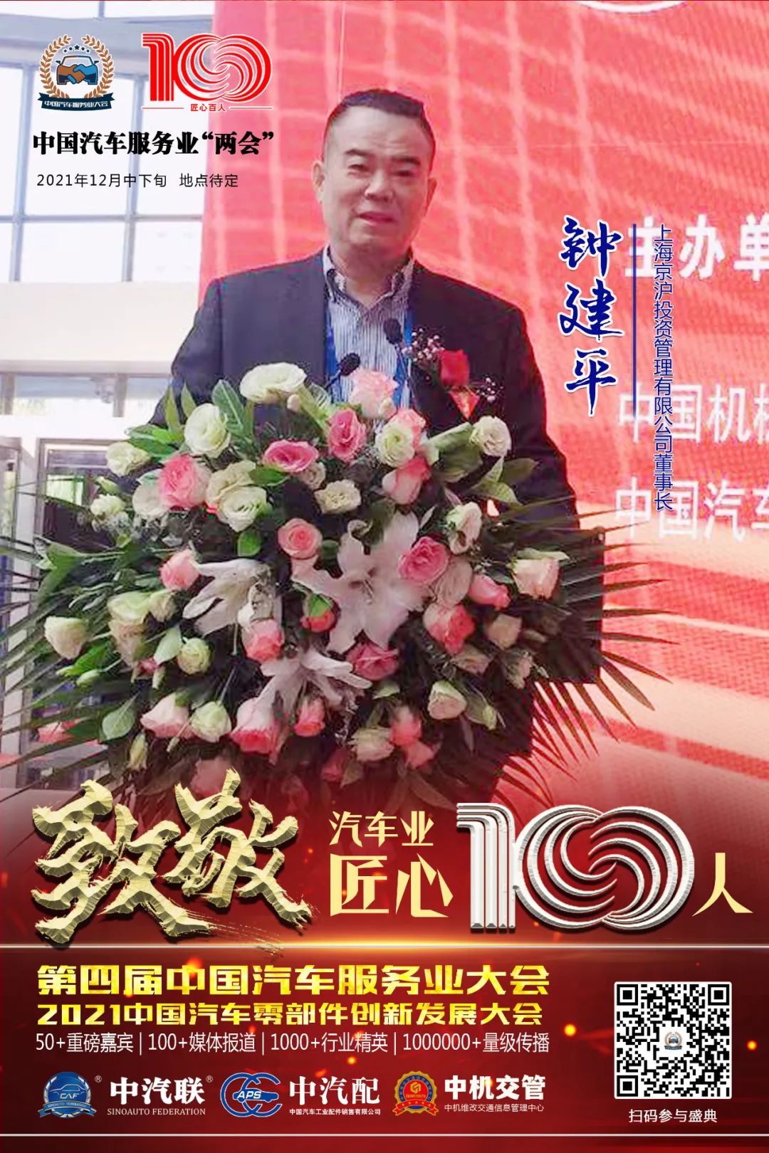 據(jù)第四屆中國汽車服務(wù)業(yè)大會組委會介紹,中汽聯(lián)常務(wù)副主席、上海京滬投資管理有限公司董事長鐘建平入選“百年百人”中國汽車業(yè)匠心100人。