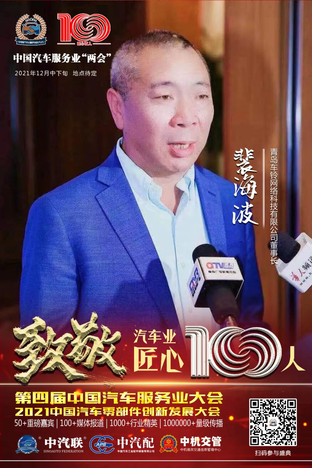 裴海波 南京理工大學(xué)系統(tǒng)工程專業(yè),1992年進(jìn)入汽車后市場,曾自主創(chuàng)業(yè)從事汽配和維修行業(yè),有二十余年汽車后市場行業(yè)管理實(shí)戰(zhàn)經(jīng)驗(yàn),是國內(nèi)事故車殘值處理商業(yè)化第一人。先后擔(dān)任青島市二手車評(píng)估協(xié)會(huì)副會(huì)長、山東省價(jià)格評(píng)估協(xié)會(huì)副會(huì)長、南京理工大學(xué)山東校友會(huì)會(huì)長等社會(huì)職務(wù),并被評(píng)為南京理工大學(xué)杰出校友、南京理工大學(xué)校友企業(yè)家紫金互聯(lián)網(wǎng)人物、南京理工大學(xué)教育發(fā)展基金會(huì)資助者之一。2019年榮獲“新中國成立70年 汽車服務(wù)業(yè)70人”功勛人物榮譽(yù)稱號(hào),榮膺“2020青島年度新銳經(jīng)濟(jì)人物”、2020“中國汽車工業(yè)創(chuàng)立70年 汽車業(yè)最美奮斗者70人”模范先鋒人物等榮譽(yù)稱號(hào)。