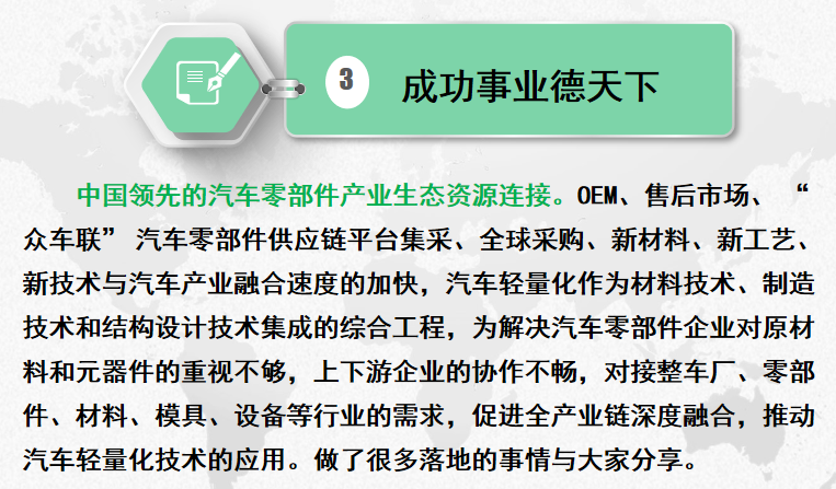 在汽車制造業(yè)和汽車后市場(chǎng)服務(wù)行業(yè)沉積了豐富的人脈資源,整合智能制造供應(yīng)鏈,汽車零部件全產(chǎn)業(yè)鏈眾多項(xiàng)目落地,推動(dòng)中國(guó)汽車零部件輕量化發(fā)展。中國(guó)零部件企業(yè)真正掌握核心技術(shù),這是田亞梅的“中國(guó)夢(mèng)”。