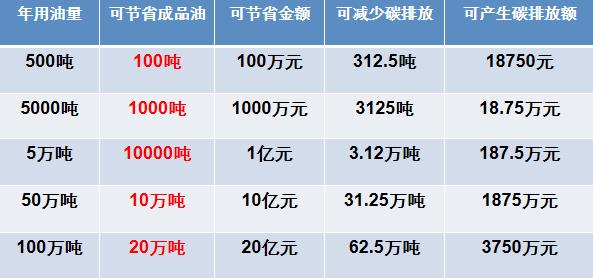 按照使用金聖節(jié)能環(huán)保燃油后可增加燃油利用效率20%,按照每噸成品油批發(fā)價(jià)10000元,根據(jù)我國目前碳交易價(jià)格均價(jià)每噸60元進(jìn)行推算: