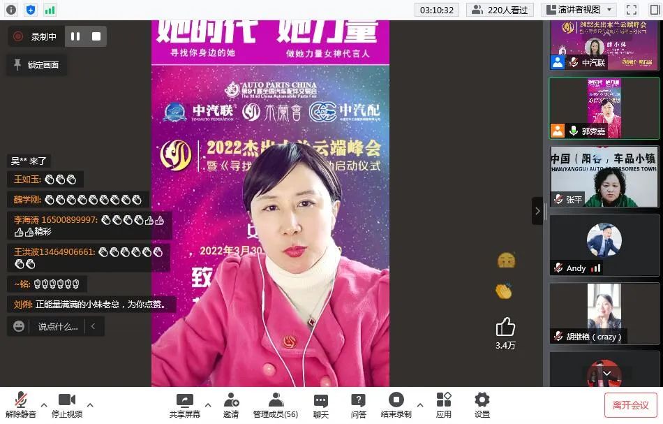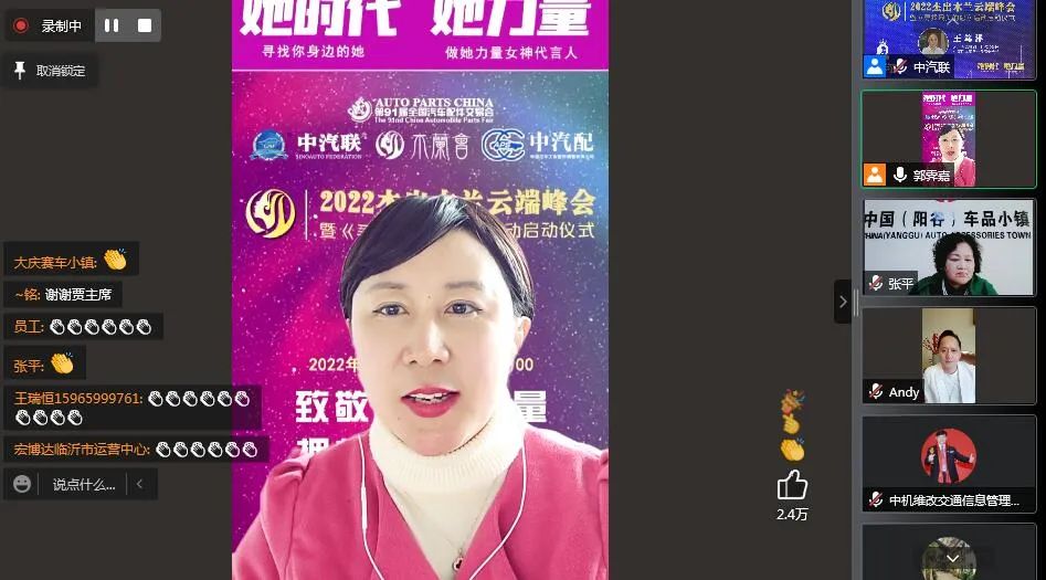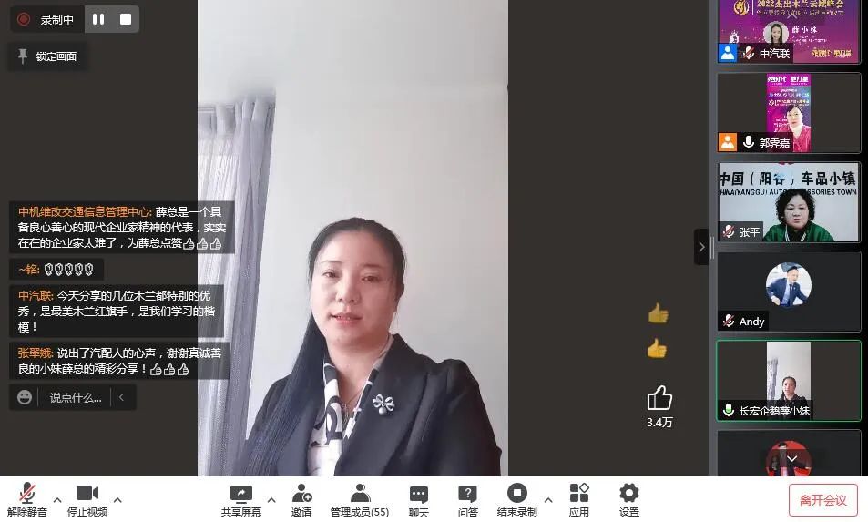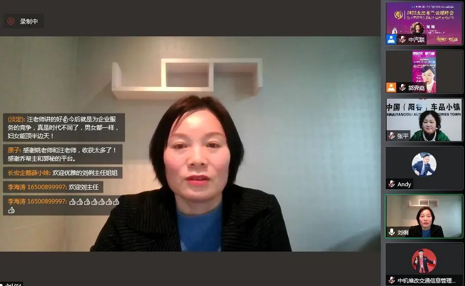 木蘭會聯(lián)席主席、中汽聯(lián)秘書長郭霽嘉作了總結(jié)發(fā)言。郭秘書長認為木蘭是社會進步的重要力量。國家的發(fā)展、民族的興旺、社會的進步,離不開“她力量”的推動。在當前我們面對的舉世矚目的抗疫阻擊戰(zhàn)中,更少不了木蘭這群“鏗鏘玫瑰”的美麗身影,她們用實際行動,在抗疫戰(zhàn)線上樹起了一道靚麗的風景線,她們用青春和汗水,譜寫了社會主義新時代的贊歌,她們是無愧于國家、無愧于人民的“巾幗英雄”。新時代木蘭,更是要以楷模之光照亮前行之路,看齊“巾幗英雄”筑夢前行,感悟她們“俯首甘為孺子牛”的奉獻精神,要充分發(fā)揚“甘做嫁衣、甘為綠葉”的奉獻精神書寫無愧于時代、無愧于人民、無愧于歷史的精彩答卷,共同書寫共和國的千秋偉業(yè)。