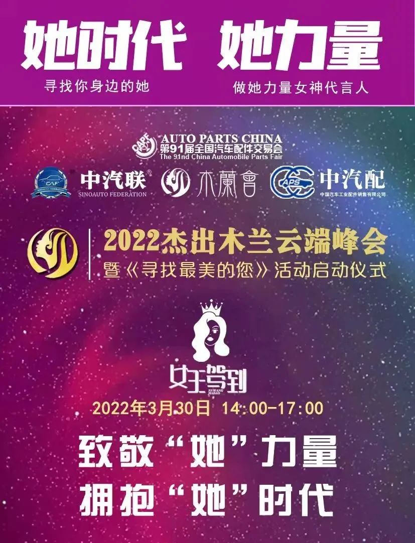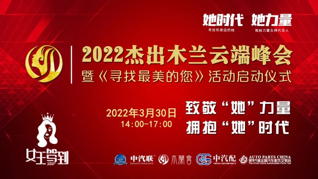 2022年3月30日,“致敬‘她’力量 擁抱‘她’時代”為主題的“2022杰出木蘭云端峰會暨《尋找最美的您》系列活動啟動儀式”在線上成功舉辦。本次峰會由第91屆全國汽車配件交易會特別支持,中汽聯(lián)、木蘭會、中國汽車工業(yè)配件銷售有限公司主辦。峰會聚焦當代女性價值觀理念,探討如何在生機與挑戰(zhàn)共存、創(chuàng)新與奮斗并進的時代,克服困難突破局限,激發(fā)內(nèi)心力量,綻放女性光芒等社會關注話題,全面剖析木蘭創(chuàng)業(yè)心路歷程,再現(xiàn)木蘭在推動企業(yè)創(chuàng)新發(fā)展過程中舉足輕重的力量,以奔跑奮進的姿態(tài),譜寫木蘭“半邊天”的壯麗詩篇,以特殊的方式迎接黨的二十大勝利召開,助推中國汽車產(chǎn)業(yè)高質(zhì)量發(fā)展!