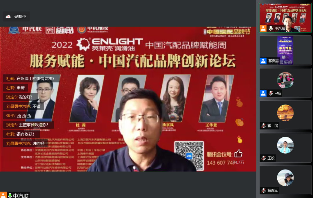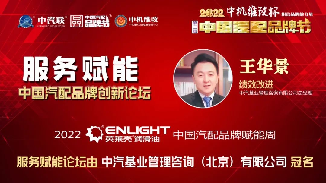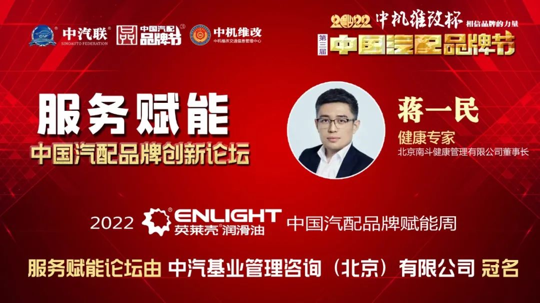 2022年5月18日,“2022 英萊殼杯 中國汽配品牌賦能周”的第三場活動,由 中汽基業(yè)管理咨詢(北京)有限公司特約冠名的“服務(wù)賦能 · 2022中國汽配品牌創(chuàng)新論壇”在線上成功舉行,北京南斗健康管理有限公司董事長蔣一民、北京科潤教育文化發(fā)展公司總經(jīng)理杜莉、北京聚才港科技有限公司總經(jīng)理王松、新價值私董會副總經(jīng)理楊京鳳、中汽基業(yè)管理咨詢(北京)有限公司總經(jīng)理王華景等五位大咖作為嘉賓做了精彩分享,得到了眾多汽配企業(yè)家的關(guān)注,點(diǎn)贊量達(dá)到了360000個。服務(wù)賦能論壇由中汽聯(lián)執(zhí)行會長、中汽協(xié)汽車技術(shù)研究院院長喬永鋒主持。