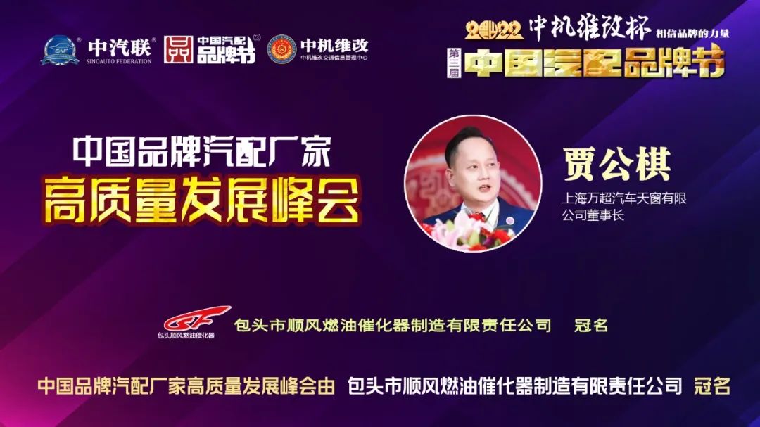 中國汽配品牌節(jié)主席、中汽聯(lián)主席、上海萬超汽車天窗有限公司董事長賈公棋 出席2022中國品牌汽配廠家高質(zhì)量發(fā)展峰會并作了精彩發(fā)言。賈總是全國知名的溫商,現(xiàn)擔(dān)任上海萬超汽車天窗有限公司董事長、柳州萬超汽車天窗有限公司董事長、鄭州萬超汽車零部件有限公司董事長、上海萬騁汽車安全系統(tǒng)有限公司董事長、上海萬龍汽車機(jī)電有限公司董事長、上海市浙江溫州商會常務(wù)副會長,河南省溫州商會第一屆理事會執(zhí)行會長,鄭州市溫州商會第一屆理事會執(zhí)行會長、溫州市汽車摩托車運動協(xié)會名譽主席、中汽聯(lián)主席、中國汽配品牌節(jié)主席等職務(wù)。