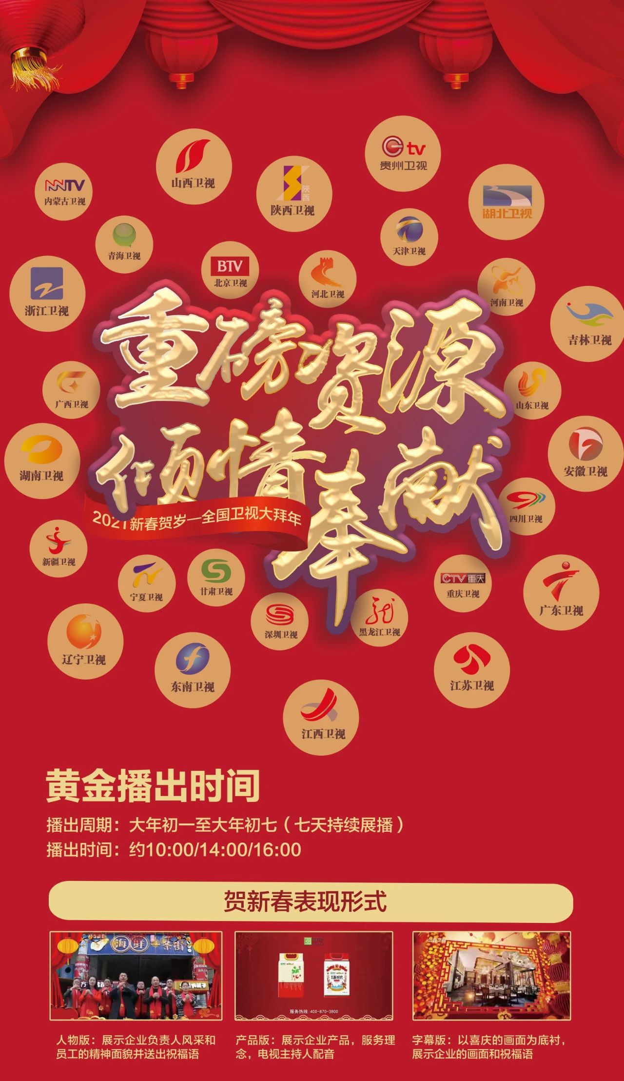 我們誠邀各企事業(yè)單位、公司、社會團體及商家在“衛(wèi)視-高鐵-春晚-直播”等全國重要平臺進行大拜年,給全國人民送上新春祝福,展示單位新風采,提升單位知名度和影響力;宣傳企業(yè)產(chǎn)品、企業(yè)形象,提高企業(yè)知名度與美譽度,展現(xiàn)行業(yè)新氣象實現(xiàn)新作為,營造熱烈喜慶、歡樂祥和的節(jié)日氛圍!