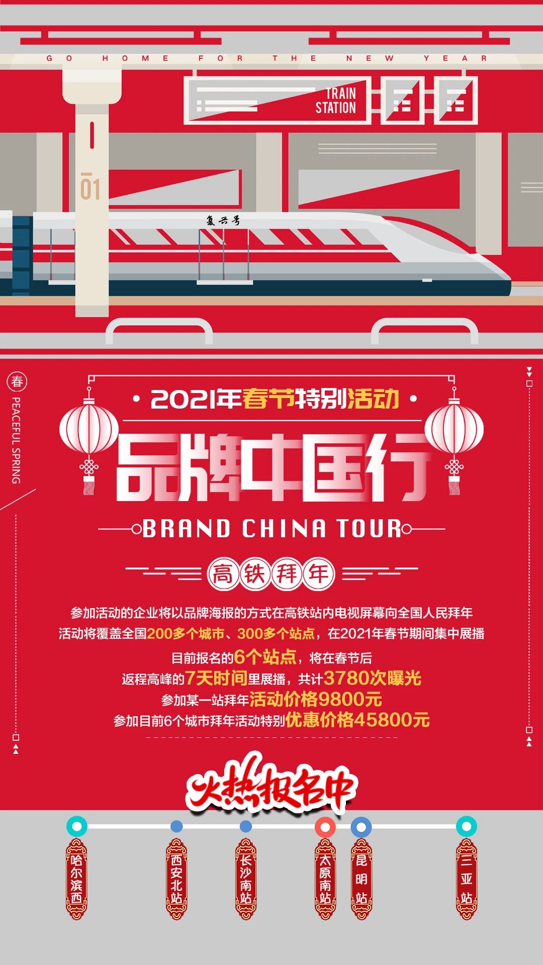 哈爾濱西、西安北站、長沙南站、太原南站、昆明站、三亞站為中汽聯(lián)特別推薦站點,5秒7天每天90次展播,總計3780次曝光,單站市場價18000元,中汽聯(lián)特惠價9800元,6站聯(lián)播僅需45800元,名