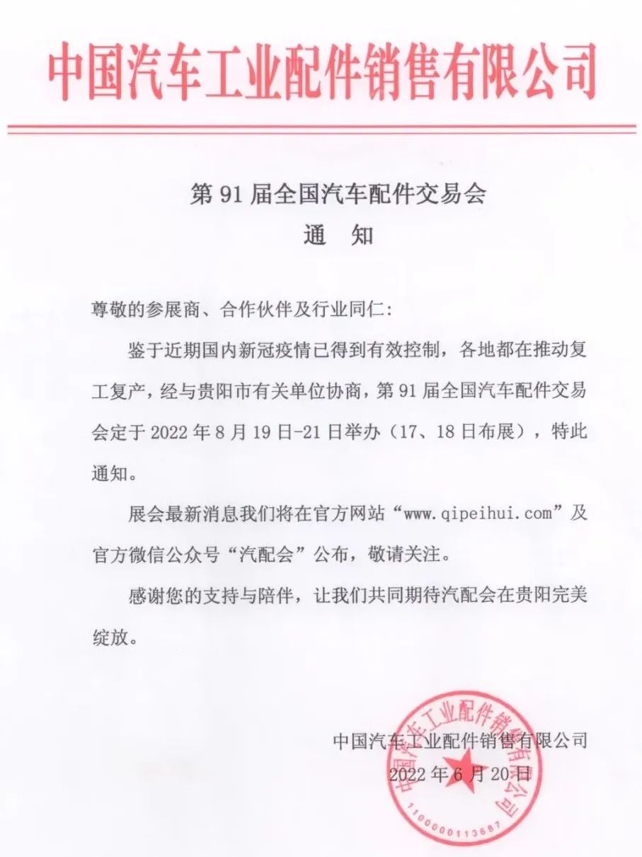 根據(jù)中國汽車工業(yè)配件銷售有限公司的展會安排,第91屆全國汽車配件交易會定于2022年8月19日--21日在貴陽國際會展中心舉行,歡迎全國展商踴躍參展,共襄盛舉。